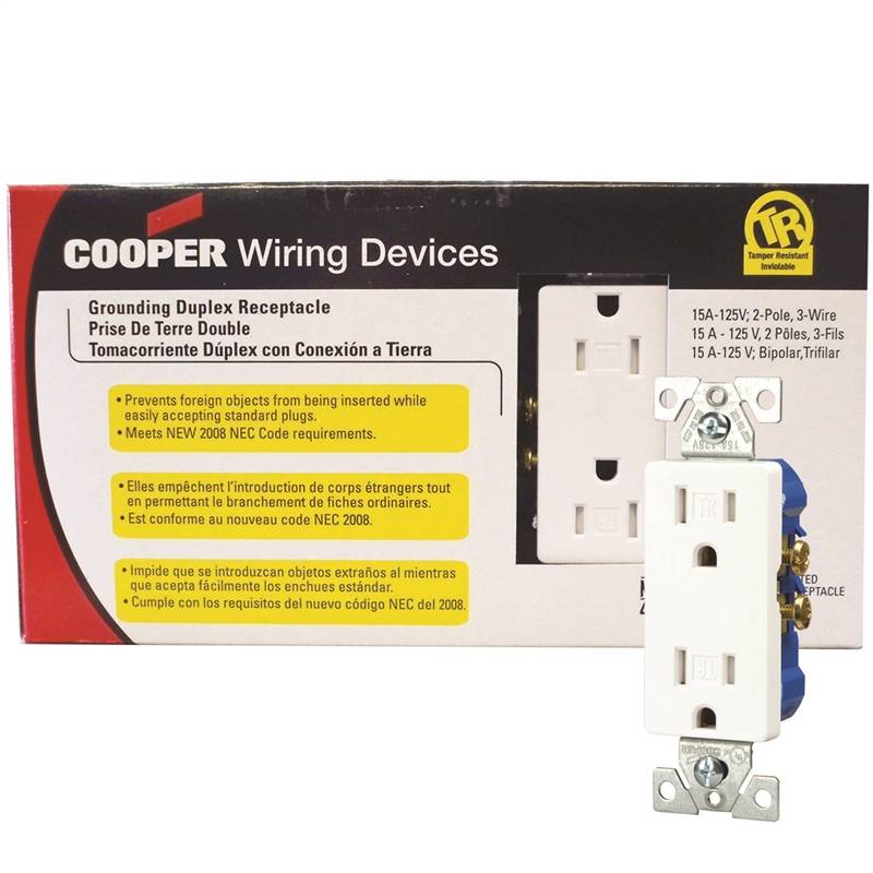 Receptacle is tamper resistant with a UL Listed shutter system and impact-resistant thermoplastic face and back body that is virtually unbreakable. The 2008 National Electrical Code (NEC) states that "Effective January 1, 2008, all receptacles installed in new dwelling units must be tamper-resistant." Features a wire stripper for number 14 and number 12 wire, extra long and wide mounting straps and tri-combo screws that accept slotted, Phillips and Robertson-head tools. Terminal screws are backed out and ready to wire. Side-wire terminals accept up to number 10 solid or stranded wire. Push in terminals accept number 14 solid wire. Screw-catch feature speeds wall plate installation. 15 amp, 125 volt. NEMA 5-15R. UL, cULus Listed.