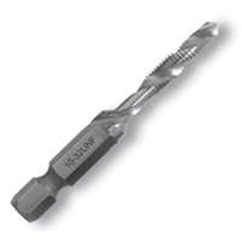 Drill/tap high-speed steel bit, split point with web thinning. High quality hex shank to ensure strong connection to drill chuck. Complete hole drilling, tapping and deburring/countersinking in one operation with power drill. Designed to tap up to 10 gauge metal. Back taper or deburr/countersink beyond tap to prevent thread damage from over-drilling.