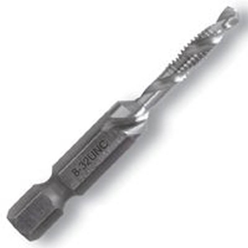 Drill/tap high-speed steel bit, split point with web thinning. High quality hex shank to ensure strong connection to drill chuck. Complete hole drilling, tapping and deburring/countersinking in one operation with power drill. Designed to tap up to 10 gauge metal. Back taper or deburr/countersink beyond tap to prevent thread damage from over-drilling.