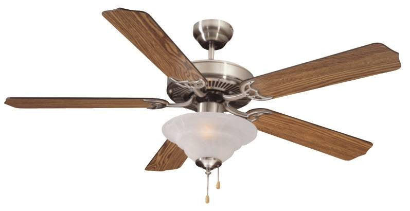 Reversible 3-speed pull chain controlled 153 x 13mm single capacitor motor for up or down flow. 5 MDF reversible blades. Alabaster Dome light kit uses two 60 watt maximum E12 base bulbs, included. Has a 190 watt limiter device and a safety cable.