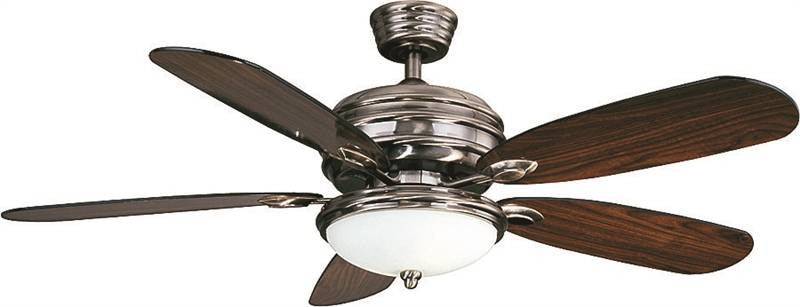 Ceiling fan, 52" with 5 walnut or black reversible blades. 4" x 3/4" down rod mounting. 13.5 degree blade pitch. 3 speed reversible motor for up or down flow. Designer appearance, concealed blade and mounting hardware, flywheel blade arms conceal motor shaft. Full function handheld wireless remote. Vintage pewter finish. Frosted white glass light kit uses 2 E27 base spiral CFL bulbs, 13 watt, (included). With a safety cable. UL Listed.