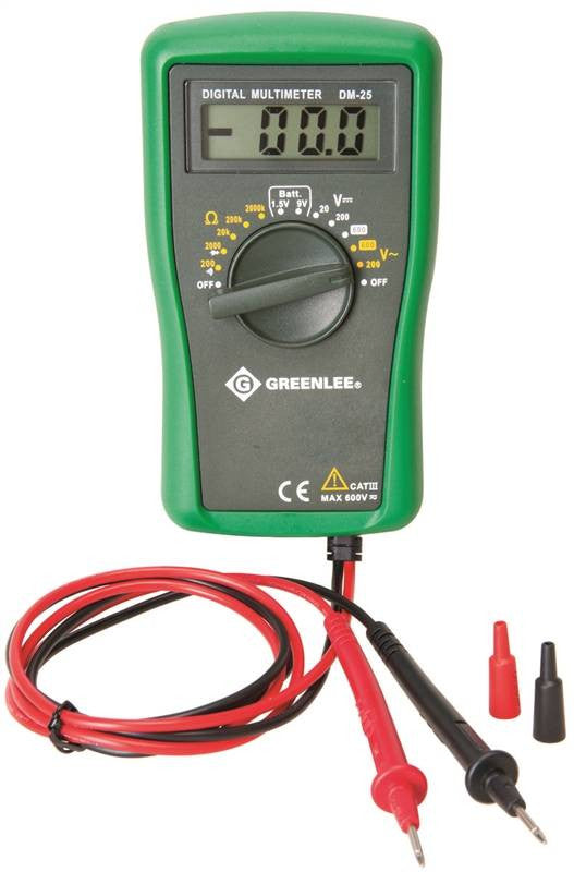 Use to measure voltage and check batteries, measure current of small electronic circuits. 600 volt AC/DC voltage. Resistance measurement. 1.5 volt/9 volt battery test. Continuity and diode tests. Built-in test leads and a rubber boot to protect meter from damage. 9 volt battery included. Measurement category: CAT III, 600 volt. ETL approved.
