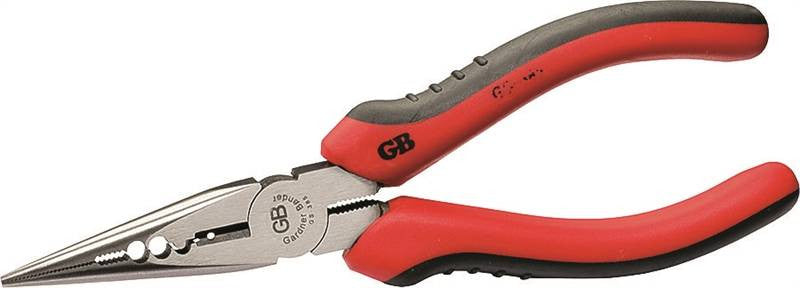 Multi-function long nose pliers cut, strip and crimp. Use needle nose to form wire or grip small parts. Strips number 14 - number 16 AWG solid or stranded wire. Crimps insulated terminals up to number 10 AWG. Cuts solid or stranded wire. Serrated jaw and cushioned grips.
