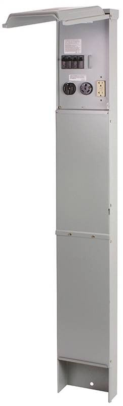 Unmetered earth burial pedestal with 50 amp, 30 amp and 20 amp GFCI circuit protected receptacles. 16-gauge zinc coated G-90 steel, with electro-deposition finish resists corrosion and fading. NEMA 3R rainproof enclosure protects against weather, vandalism and nuisance tripping. Factory wired, assembled and tested. All-in-1 construction for factory assured terminations. Suitable for use as service entrance equipment when installed in accordance with the National Electric Code. Accepts copper or aluminum wire for added installation flexibility. Rolled edge door for cord protection. Dead front construction prevents accidental contact with live parts. Stay open position on door for convenience. Padlock provision. UL/CUL Listed (power outlets).19.125" height x 9" width x 3.5" depth, 47 lb.