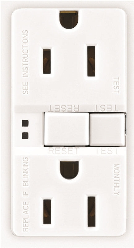 Automatic testing GFCI receptacle. If no GFCI protection is present, the receptacle will render itself inoperable and a red indicator light will glow.