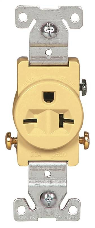 Straight blade receptacle. Meets all UL and CSA specifications. Triple wire line contacts provide excellent long-term plug retention. High impact and chemical-resistant nylon face. Side wire terminals accept up to #10 solid or stranded wire. Terminal screws backed out. 20 amp, 250 volt.