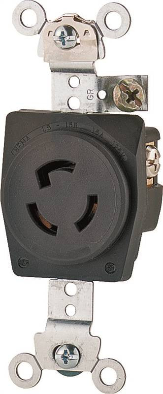 Single locking receptacle. Glass reinforced nylon body and face. One piece brass contacts. Back and side wire terminal clamps. 15 amp - 125 volt. CSA certified. NEMA L5-15.