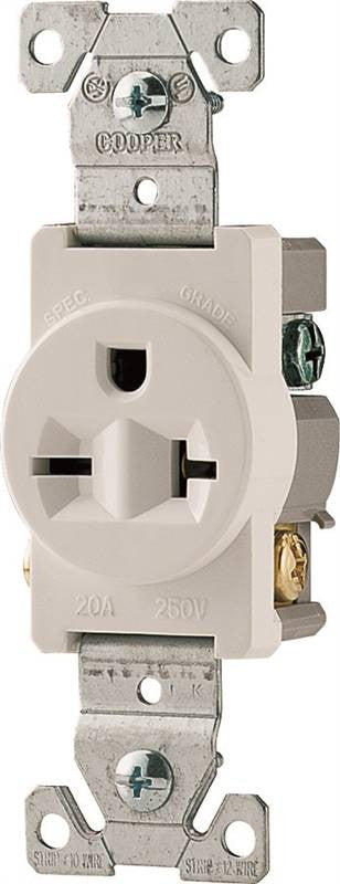 Straight blade receptacle. Meets all UL and CSA specifications. Triple wire line contacts provide excellent long-term plug retention. High impact and chemical-resistant nylon face. Side wire terminals accept up to #10 solid or stranded wire. Terminal screws backed out. 20 amp, 250 volt.