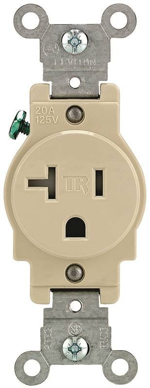 Narrow body single receptacle, straight blade, tamper-resistant, commercial grade, grounding, back and side wired, steel strap. 125 volt, NEMA 5-15R.