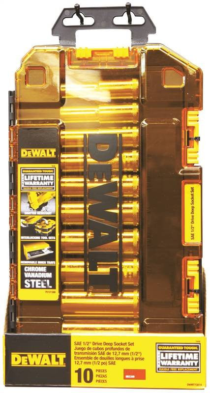 Lockable stacking case; durabel transparent lid; removable internal tray; exceeds ANSI specifications; knurled beauty rings help reduce slippage for hand tightening applications. Set includes: 1/2" Drive SAE deep sockets: 7/16, 1/2, 9/16, 5/8, 11/16, 3/4, 13/16, 7/8, 5/16, 1".