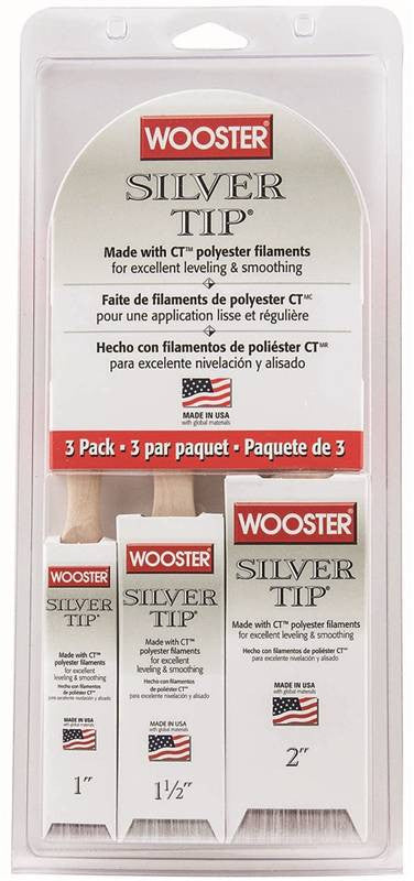White & silver CT polyester filaments for excellent leveling and smoothing. Very soft formulation, feather stroke. Stainless steel ferrule. Hardwood handle. Includes one each - 1" Silver Tip Thin Angle Sash, 1-1/2" Silver Tip Angle Sash, and 2" Silver Tip Varnish.