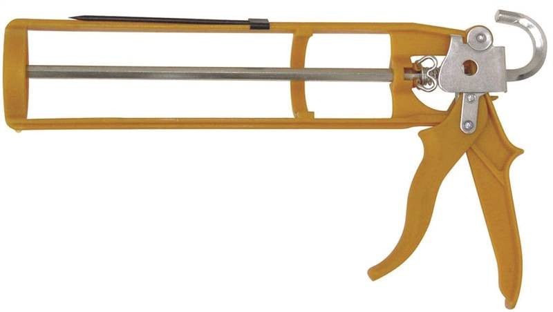 Lightweight fiberglass reinforced nylon frame. Drip-free spring clip drive designed as an automatic stop flow mechanism. Tempered steel rod and parallel frame for trouble-free performance. Built-in spout cutter and ladder hook. Non-corrosive handle holds up to the toughest materials. 5:1 thrust ratio.