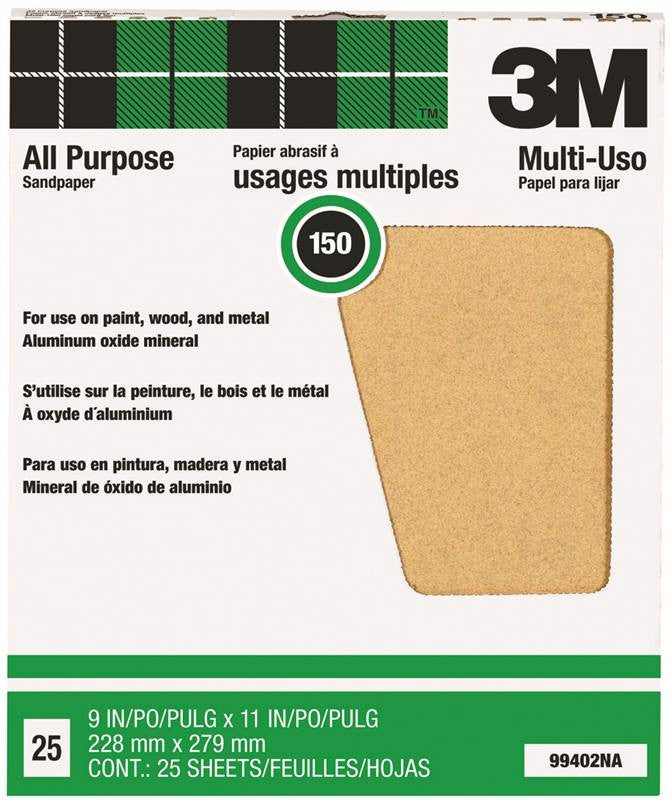 Tough, durable, long-lasting abrasive for general-purpose sanding; effective on wood, metal, plastic, drywall, fiberglass, and painted surfaces. Packaging strong enough to use as storage container for unused sheets.
