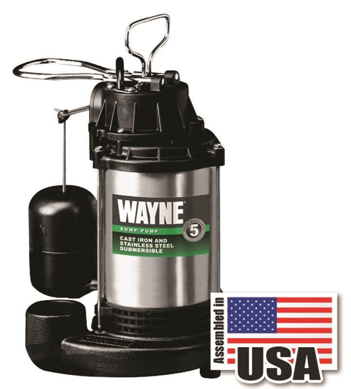 3/4 HP cast iron and stainless steel submersible sump pump. Assembled in the US with foreign and domestic parts. Top suction design eliminates air locks and clogging from debris in bottom of sump pit. Stainless steel motor housing and rugged, cast iron pump base. Fully submersible. 3/4 HP; max flow rate is 4600 GPH at 0 ft. 1 1/12 in. NPT discharge. For use in 11 in. diameter or larger sump basins. 9 in. ON level and 4 in. OFF level.