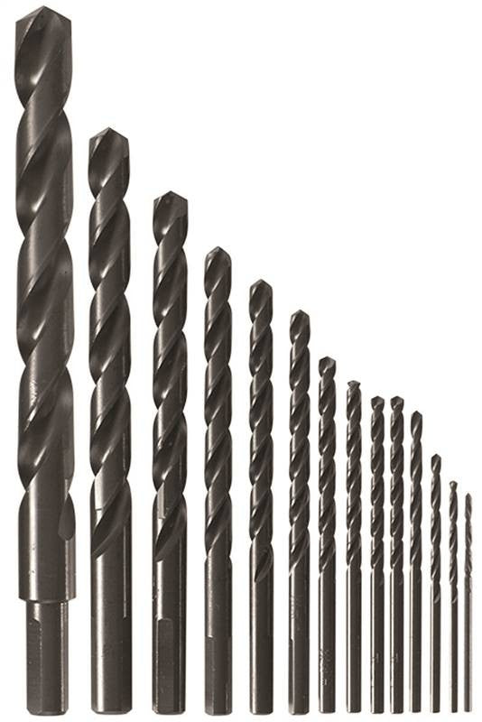 Universal drilling applications designed for contractors, electricians and other pros who need solid, reliable bits for general application drilling in wood, plastic and light gauge metal. The split-point tip has been engineered for no-skate starts and clean, accurate holes. The bit provides longer life than standard drill bit, thanks to the tip design and black oxide coating. The three-flank shank design on bits 3/16" and larger promotes better gripping and guards against slipping. High visibility marking provide clearly marked diameter. Includes: (1) 1/16", (1) 5/64", (1) 3/32", (1) 7/64", (2) 1/8", (1) 9/64", (1) 5/32", (1) 3/16", (1) 7/32", (1) 1/4", (1) 5/16", (1) 3/8", (1) 1/2" and a convenient plastic case.