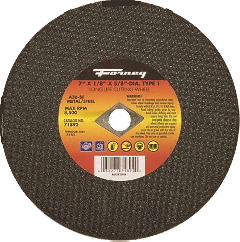 7" (177.8mm) x 1/8" (3.18mm) type 1 steel cutting wheel with 5/8" (15.88mm) arbor. Aluminum oxide metal cutting wheel. Designed for metal cutting, metal abrasion, body work, metal fabrication and general repair work. Designed to be used on circular saws only.  Wheel size: 7"; Thickness: 1/8"; Arbor 5/8" dia. Maximum rpm: 8,600; Dia: 7/8 - 5/8. Tool type: circular saws.