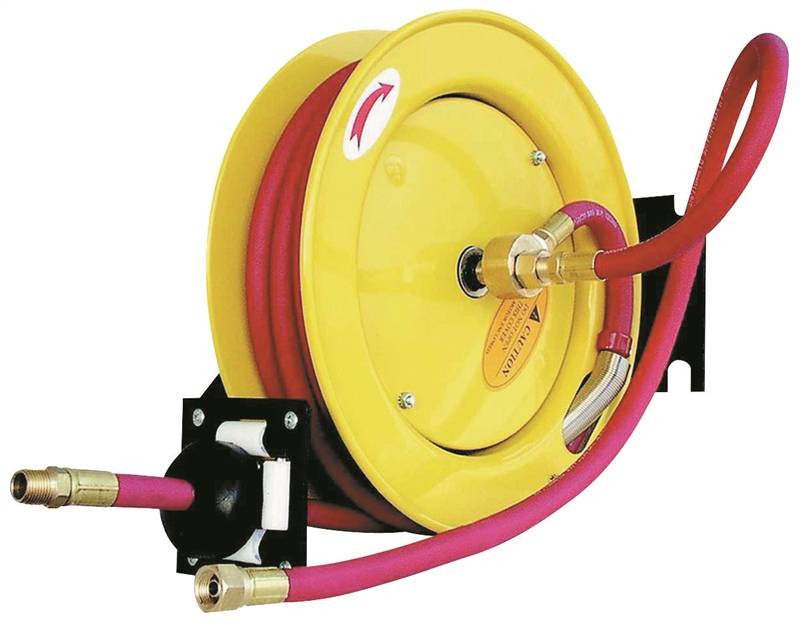 All steel construction for industrial applications. Spring powered auto rewind. Ideal for mounting of wall, floor or ceiling. Guide arm adjustable for different angles. Valve assembly handles up to 250 PSI and 25 cfm. Locking ratchet brake.