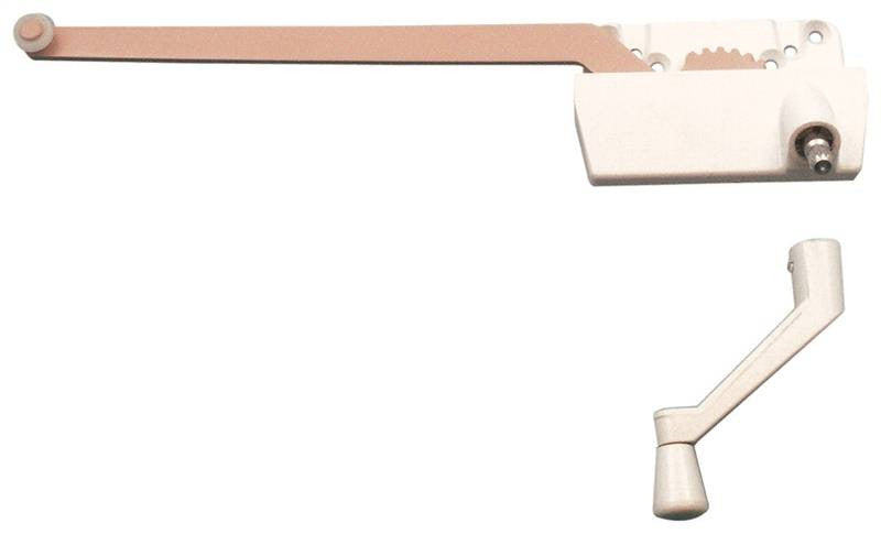 High pressure diecast zinc case, handle and knob in baked enamel finish. Hardened steel 9-1/2" arm, drive worm and gear are protected with corrosion resistant finish. Nylon roller assures smooth operation; operator provides a full 90 degrees window opening and disconnects easily from the sash. Includes 1 operator, 1 handle and 1 set of installation screws.