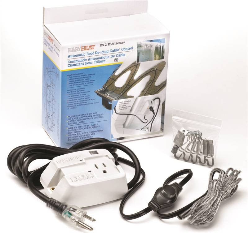 Controller for the roof and gutter de-icer cable. Controller requires two conditions to be present before it will energize the roof de-icing cable. It requires cold temperatures and the presence of run-off water from the roof in contact with the sensor wire. If only one of the conditions exists, the control will not turn on the cable. A switch inside the house can control the box.