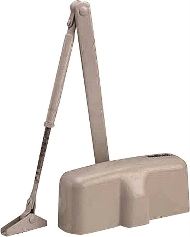 Surface mount residential door closer. Body constructed of cast aluminum with power size 2, built-in non hold-open, plastic cover. Includes standard Arm. 180 degree opening angle. UL Approved.