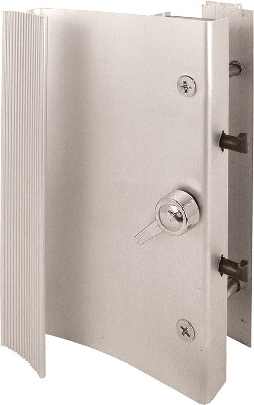 Handle Set, 3-7/8" Designed for Ador/HiLite doors; extruded aluminum inside and outside pulls; wood grain feature strip; handle latches into door jamb (no strike necessary). Handle Type: Surface Mounted. Latch Style: Hook Style. Contents: 1 inside pull and latch assembly; 1 outside pull; installation fasteners.