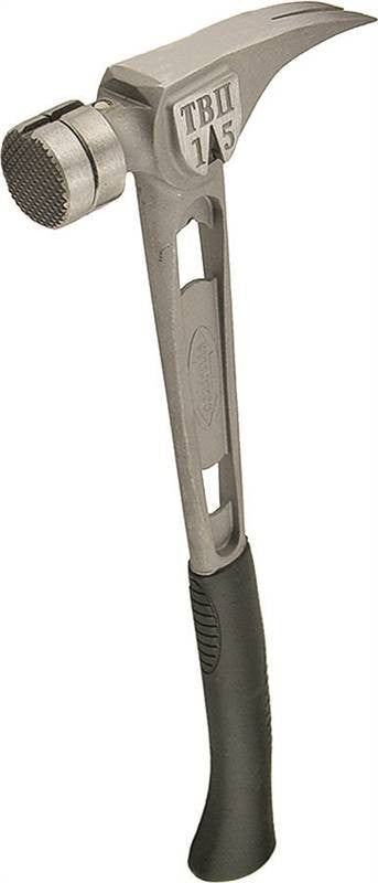 Titanium head has a replaceable steel face, magnetic nail starter and side nail puller which eases 16s nails out with one 180 degree motion. Hammer handle is cast titanium with an ergonomically contoured hard wearing black rubber grip.