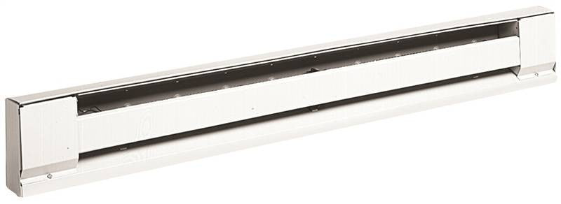 Stainless steel heating element and aluminum fins. Painted 22 gauge steel front with 20 gauge junction boxes located on each end of the heater - junction boxes contain quick connect cable clamps and 6" ground lead wires. Over-temperature thermal limit extends entire length of heated area. A full length wireway provided along the back of the heater. Safely installs with standard 60 degrees Celsius building wire. 240 volts. U.L. Listed. Thermostat Sold Separately.