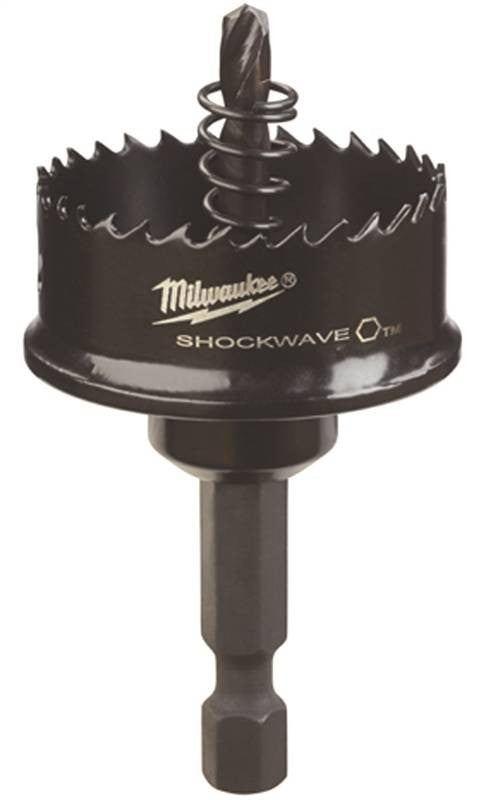 Thin wall hole saw gives professionals a hole making solution with impact drivers. 1/4" quick change hex shank. Utilizing a thin wall, 8 TPI design, delivers a burr-free cut faster than standard bi-metal hole saws. The included ejection spring removes the frustration of manually removing slugs by automatically ejecting the material. A stop shoulder design prevents over-drilling into material and potentially damaging inner components of electrical and junction boxes. For use in plastics and thin gauge metals up to 1/8" thick. 2.5" length.