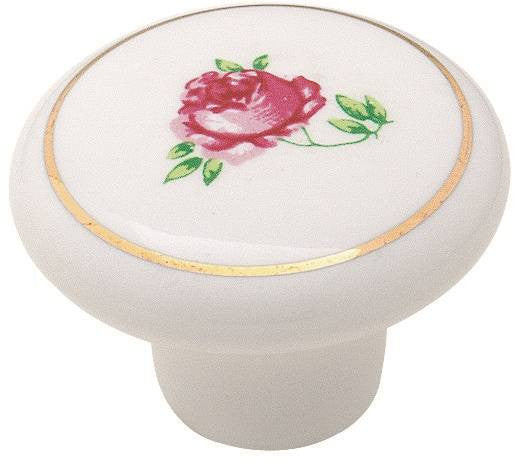 Ceramic knob with 1-1/2" diameter x 1-1/16" height. Use with one #8-32 x 1" type screw. Pink Rose Insert.