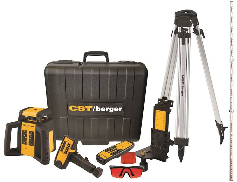A horizontal and vertical dual beam single slope interior and exterior rotary laser that delivers professional performance at an affordable price; ideal for exterior and interior general construction and aligning jobs such as grading, concrete forms and pads, site prep and elevation transfer as well as interior jobs such as building partitions, drop ceilings, electrical installation and other alignment jobs; includes: remote control, RD1 detector with bracket, laser glasses, magnetic target, adjustable wall mount, batteries, aluminum tripod, 8-feet leveling rod and a carrying case.