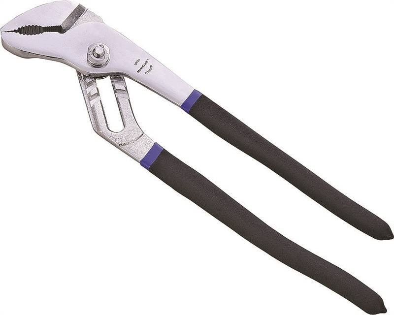 Drop forged hardened high carbon steel; chrome plated finish resists rust and corrosion; tempered and heat treated for hardness; precision milled jaws for slip-resistant grip; non-slip vinyl comfort grips; hardness meets or exceeds ANSI standards.