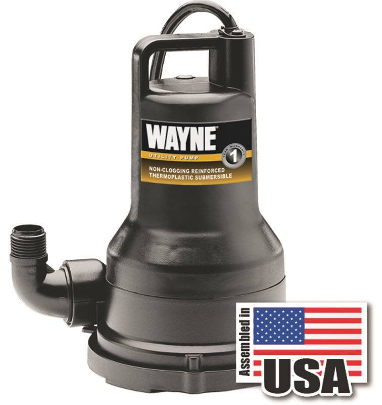 1/5 HP reinforced thermoplastic submersible utility pump. Assembled in the US with foreign and domestic parts. Pumps dirty water with small (1/2 in.) solids. Removes water down to 3/8 in. of surface. Corrosion resistant, sealed thermoplastic construction. Fully submersible. Max flow rate is 1800 GPH at 0 ft. 1 1/4 in. discharge with 3/4 in. garden hose adapter.