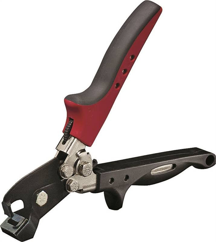 For securing vinyl skirting and siding to finishing trim. Produces wider, more secure locking tab projections. Tabs grip a greater surface area and guard against dislodging due to relaxation of vinyl from heat. Installations also resist blowout during times of high pressure and wind. Constructed of steel stampings and rugged investment cast alloy steel jaws. Nickel plate and black oxide finish with compound leverage design ergonomic REDLINE handles with unique one hand operation latch. Not Recommended for use below 32 degrees F (0 degrees C). Throat Depth 1/2"; Length 8-1/2".