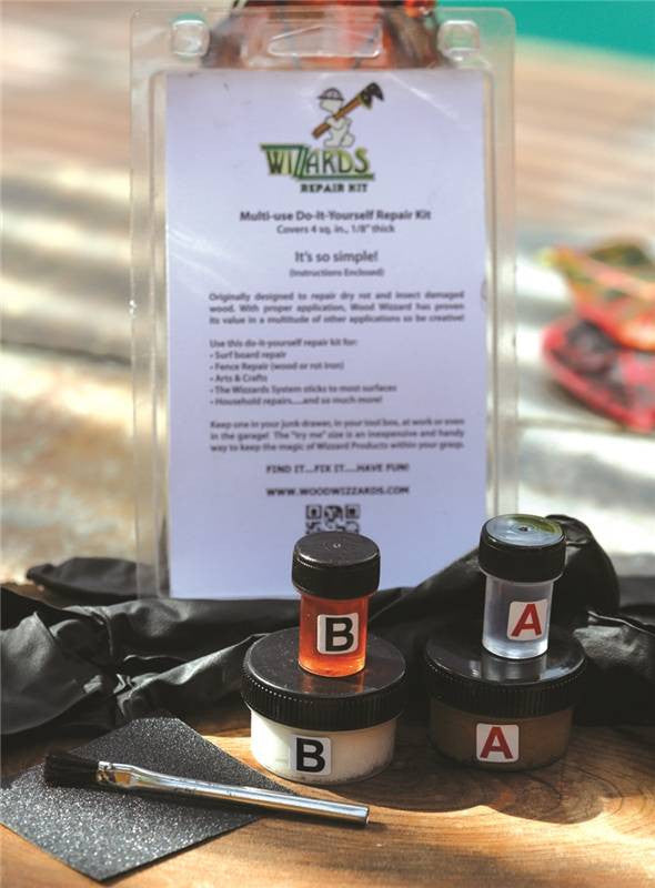 Designed to repair dry rot and insect damaged wood. Use this for surf board repair, fence repair, arts and crafts, household repairs and more. Sticks to most surfaces. Waterproof. Can be painted, nailed, screwed, sawed, drilled or textured. Includes 1 oz of part A resin and part B hardener dough and .5 oz part A resin and part B hardener liquid, a pair of heavy mil nitrile gloves, a small brush to apply A and B liquid, and a small piece of sandpaper in a clamshell package. Contents of clamshell package can be removed and bottom used to mix the A and B liquid portions.