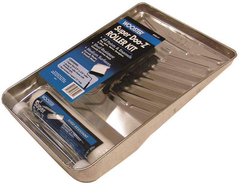 For all paints and enamels. Includes R205 Super Doo-Z 9" x 3/8" medium surface roller cover, R030 9" 5-wire cage utility frame and R402 11" wide 1-quart capacity deluxe metal tray.