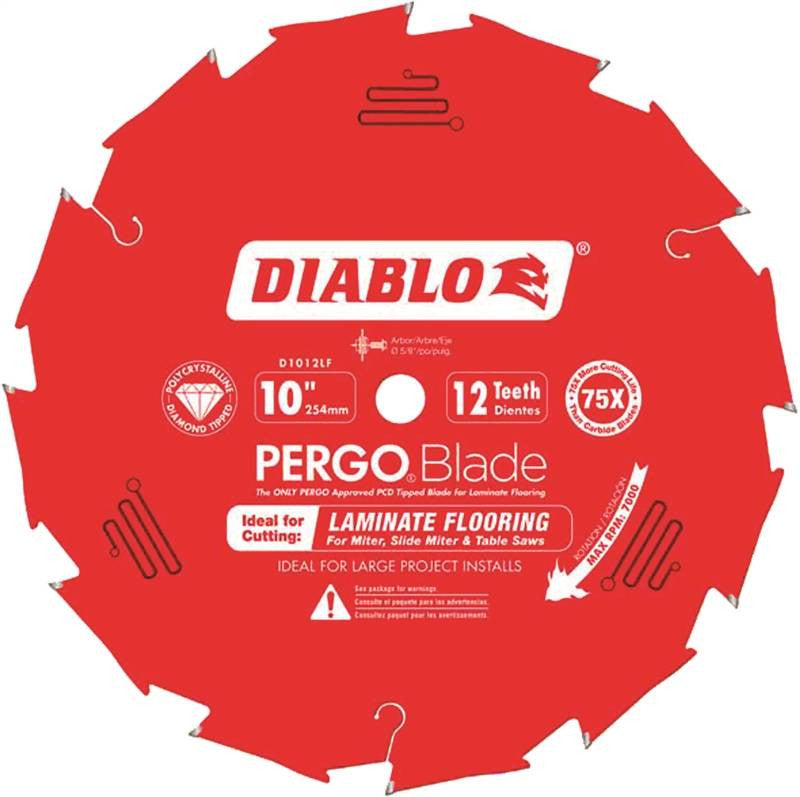 PCD tipped Pergo blade is specifically designed for cutting laminate flooring in a chop saw application. Delivers ideal cutting performance. For cutting Pergo, laminate, hardwood, engineered hardwood, bamboo and wood. Anti-kickback design re-enforces the tooth for longer life. Anti-vibration design to reduce vibration and stabilize the blade. Perma-Shield non-stick coating protects the blade from heat, gumming and corrosion. For use on Chop/Miter saw, Slide Miter saw and Table saw.