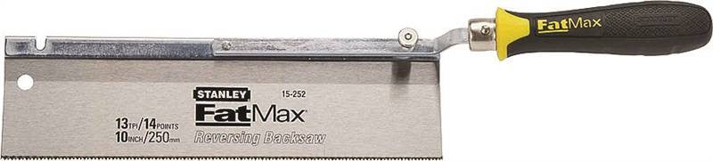 Extra wide blade 3" for fine woodworking used for precise cutting of dovetails, small joints and cutoff; steel back prevents bowing for true straight cuts. Spring-loaded pin allows blade to reverse quickly for left or right cutting, reversible handle with ergonomic cushion grip.