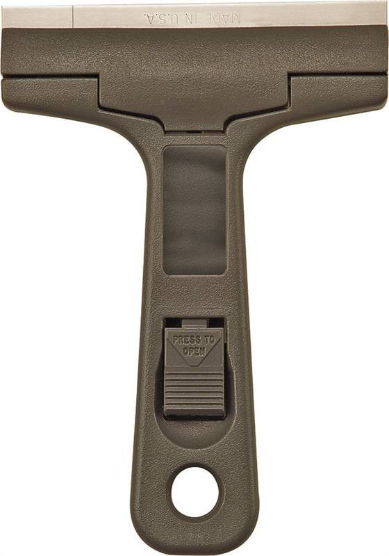 Use to remove coatings, paint and stickers from window glass. No tools required to replace blade. Rugged acetal construction resists most paint thinners. 1 blade included.