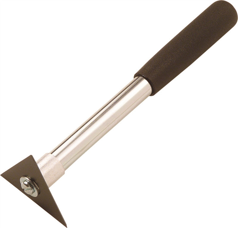 Use to scrape flat surfaces, cracks, and various molding contours. Rugged, steel blade holder and 9-3/4"L tubular metal handle with foam hand grip for durability and comfort. 2 high-carbon steel blades, including a triangle with three 2-3/4" scraping edges and a 2" x 1" teardrop.