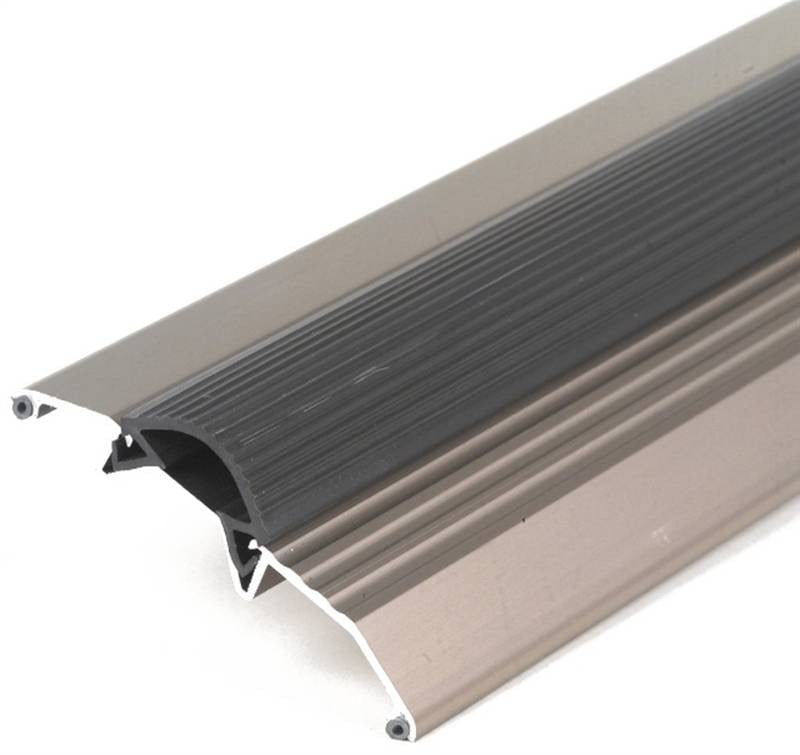 Deluxe heavy-duty threshold. Heavy extruded aluminum threshold with replaceable vinyl insert. Vinyl caulking feet seal bottom of threshold. With insert: 3/4" Height. Without insert: 1/2" Height.