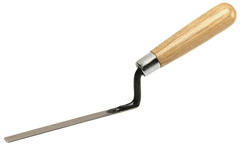 Tempered blade that is fully ground and polished. Hardwood handle with metal ferrule is securely attached. Blade size and shape allow easy access between bricks.