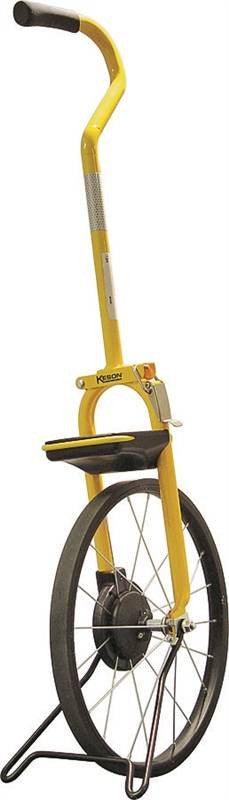 Measuring wheel with a steel frame, Swan-Neck ergonomic handle grip ensures less wrist strain and better control. Magnetic sensors for dust, dirt and other particles that can disrupt a light beam; magnetic pick-up avoids these problems. Easy to read digital counter is in the most protected spot on the wheel. With the handle up, it is nearly impossible for the counter to come into contact with the ground. With the handle down, the roll bar offers solid protection. Counter requires 2 AA batteries (not included). Display backlit 7 digit LCD display for low-light usage; Up to 99,999 ft., 11 in. or 99,999.9 in tenths and metric. Sealed counter encasement meets NEMA Class II standards, housing will not be damaged by rain, clean the entire wheel with a damp cloth.